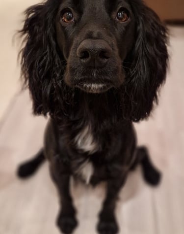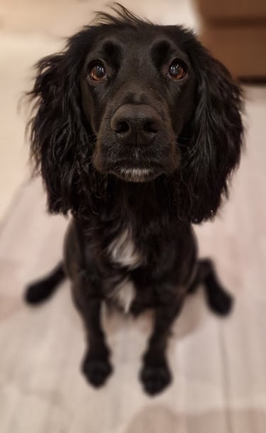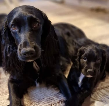 Tea oli miettinyt käyttölinjaista cockeria jo useamman vuoden ajan, sillä meidän perheessä käytännöllistä on, että koirat soveltuvat sekä metsästykseen että agilityyn. Jo vuonna 2015 agilityn sm- kisoissa Tean verkkokalvolle tallentui sähäkkä musta käyttiscockeri mieleen. Ja sehän oli silloin tietysti Moccan mummo Salli. Melko pian etsinnän jälkeen löytyi kennel Hossing, jossa sattui juuri silloin olemaan tulossa parikin pentuetta. Perusteellisen perehtymisen jälkeen ja Sannan koiriin tutustumisen jälkeen halusimme ja saimme Moccan.